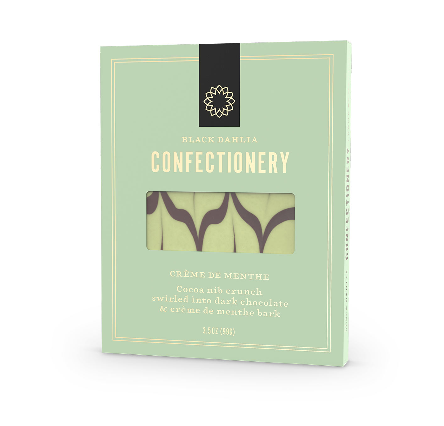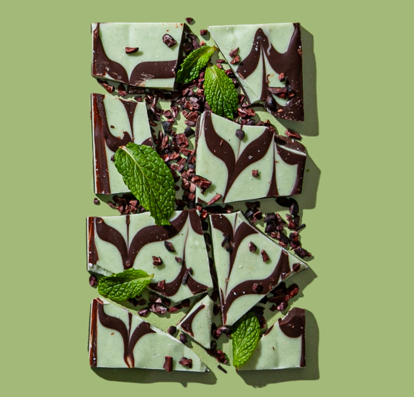 Crunchy cocoa nibs folded into layers of rich dark chocolate and smooth crème de menthe bark.
